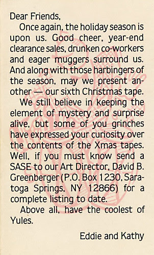 Some thirty or so years ago at this time of the year, when Lower Manhattan is shedding the Wild West image it acquires during the cash-poor '70s, several lucky humans receive Xmas greetings from a funny guy named Eddie Gorodetsky. Being a funny guy, the Eddie in question conveys his seasonal cheer in the form of a mixtape. I never meet this Mr. Gorodetsky, but I assume that he possesses something like exceptional wit, as I notice his credit on about half the programming I view on the Comedy Central network. I also award him brownie points in the yuck-yuck department as apparently this Eddie boasts of having the world's largest collection of Xmas-oriented music. Were I myself to brag about such a thing, it is a sure bet that I am laughing a-plenty on the inside.